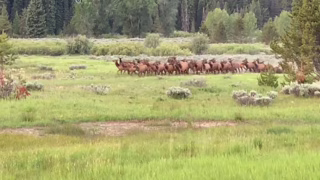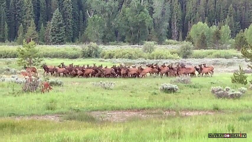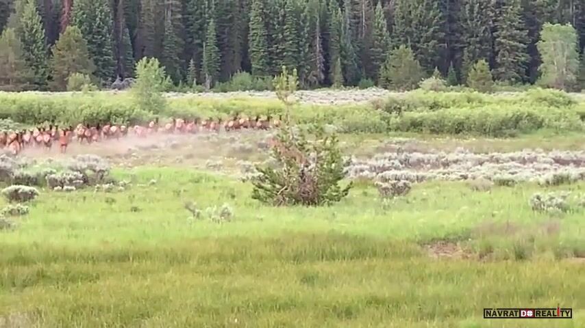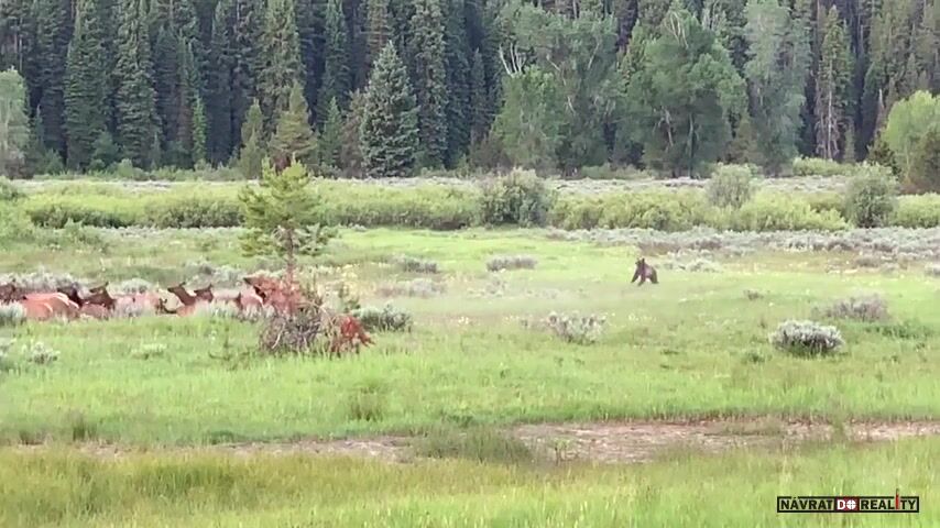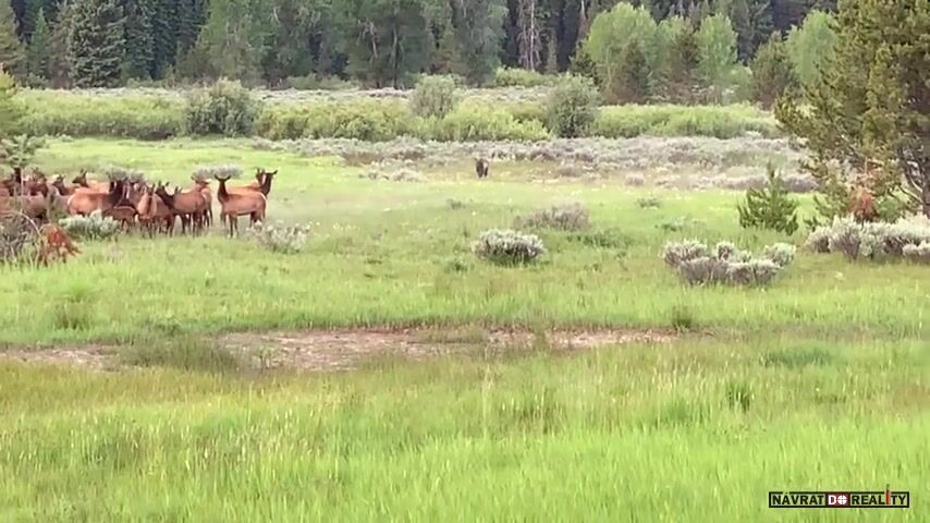 USA, Wyoming, národní park Grand Teton: Návštěvníkům se podařilo zaznamenat úspěšný útok medvěda stříbrného na stádo jelenů/losů/sobů/vim pyču co je to za mrdky.