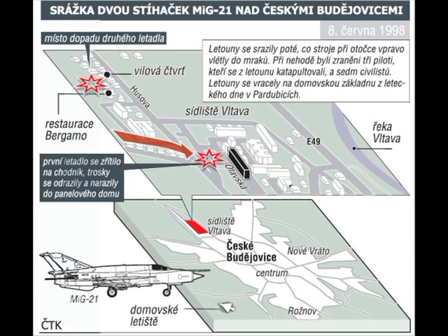 8.června 1998, České Budějovice, ČR: V 9:29 se při návratu z letiště Pardubice srazily ve výšce 600 metrů víceúčelové stíhačky MiG-21MF 7711 a MiG-21UM 3756 a dopadly do hustě osídlené části v Českých Budějovicích. Jeden MiG skončil v městské části České Vrbné cca 10 metrů od rozestavěného rodinného domku, přičemž jeho trosky poškodily nedaleký parovod. Druhý dopadl přímo na budějovické sídliště Vltava, kde zničil zastávku MHD, blízké trojelové vedení, 22 zaparkovaných automobilů (17 z nich úplně) a panelový dům, kde bylo požárem zasaženo 11 bytů (z nichž 5 zcela zničeno) a troskami poškozeno dalších 47. K události se postupně dostavilo 18 jednotek HZS okresů a SDH obcí - celkem 41 požárních automobilů a 151 hasičů. Na místě byl přítomen ministr obrany, velitel letectva, přednostka okresního úřadu a primátor města České Budějovice. Majetková škoda byla vyčíslena na 25 mil. kč + 6,5 mil. kč za MiGy. Při havárii nikdo nezemřel - zraněno bylo sedm civilistů (nejtěžší bylo zranění 48leté ženy, která utrpěla popáleniny II. a III. stupně) a tři členové posádky (středně těžká zranění), kteří se stačili katapultovat. Jak se však později ukázalo, jeden z nich neměl na palubě letounu co dělat, byl to totiž mechanik, který přemluvil pilota, aby jej vzal z Pardubic domů.