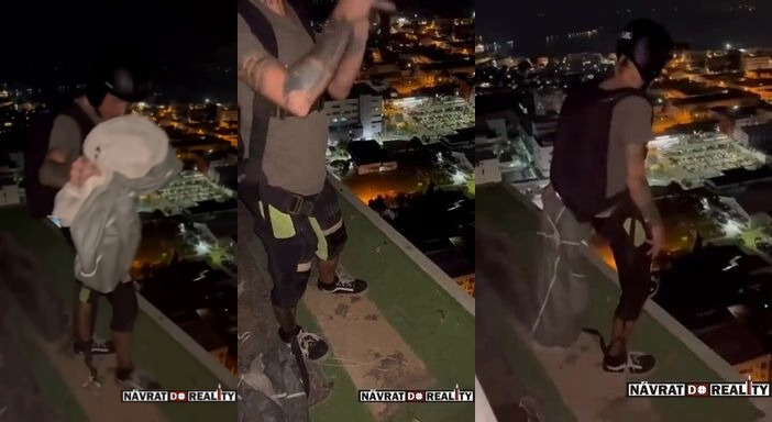Proč má ten padáček se skobou? Nějaký domácí vynález. Tak hlavně že zafungovala přilba s baterkou na dementní hlavě.