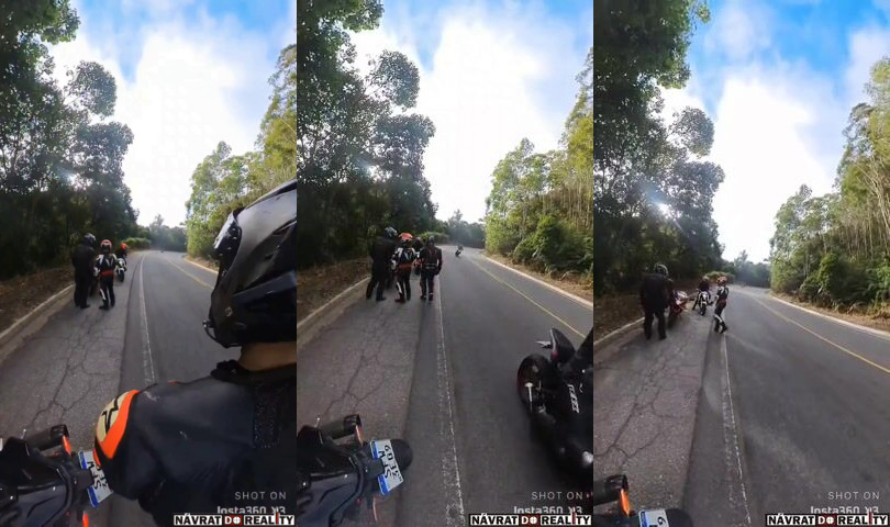Blbější místo na zastavení si vybrat nemohli. Pokud se tedy už tam někdo z nich taky nevysekal, soudě podle tý položený motorky v popředí. V tom případě už bych si jen o kus dál zřídil pohřebnictví, tam to bude bomba kšeft. :grinning:
