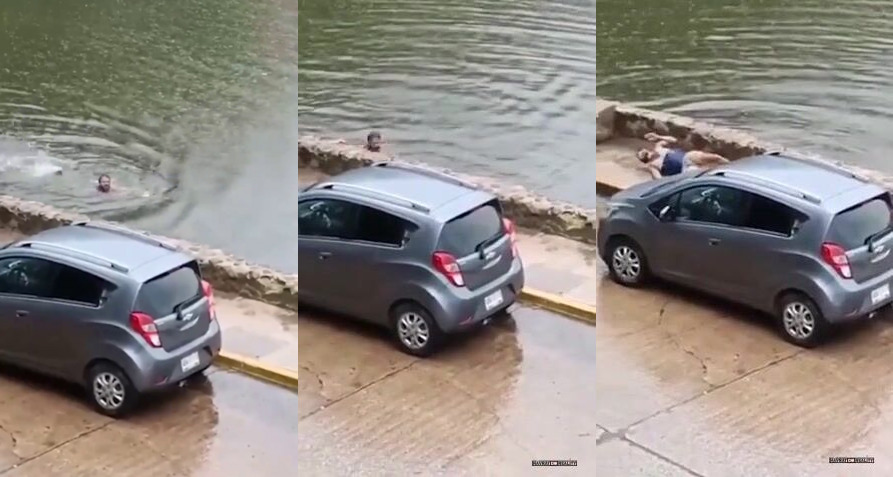 Ve videu je vidět, jak vyděšený plavec bojuje ve vodě, zatímco se k němu blíží stín obrovského plaza, který se mu pokusí chytit nohu. Muži se nakonec podařilo doplavat k obrovské kamenné zdi, kde se snažil uniknout krokodýlovým spárům.
