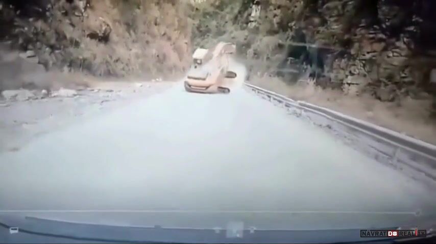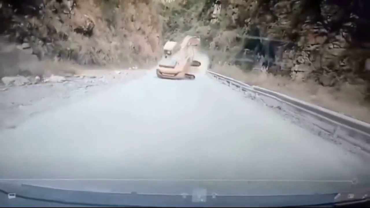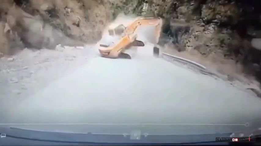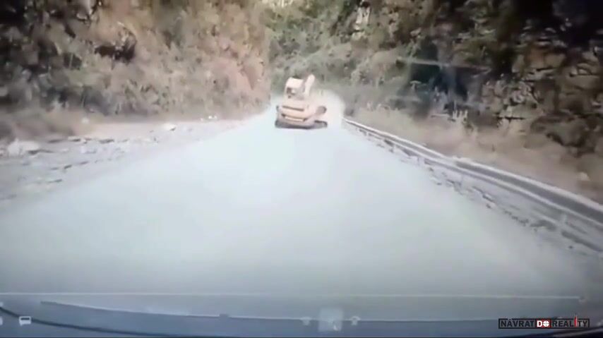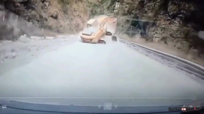 Bagr řítící se proti couvajícímu autu na horské silnici