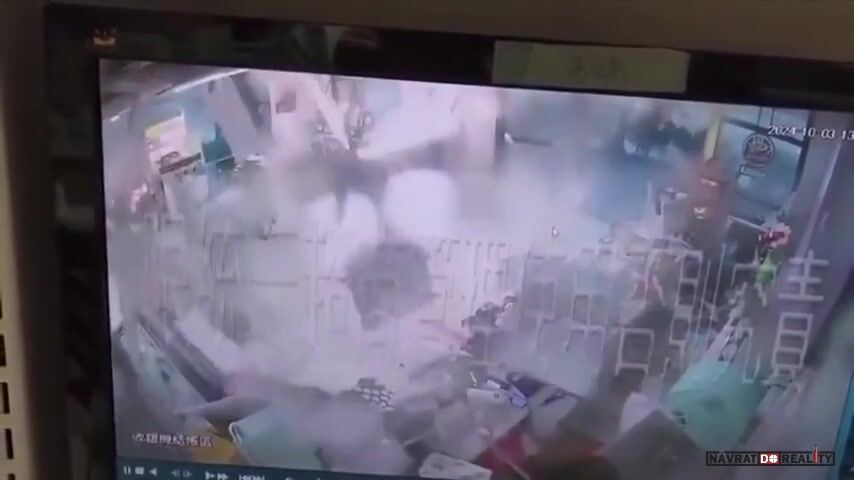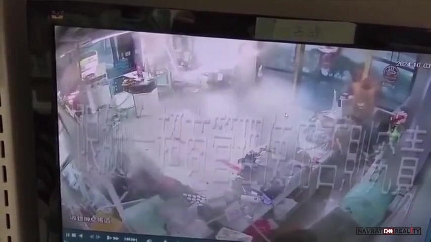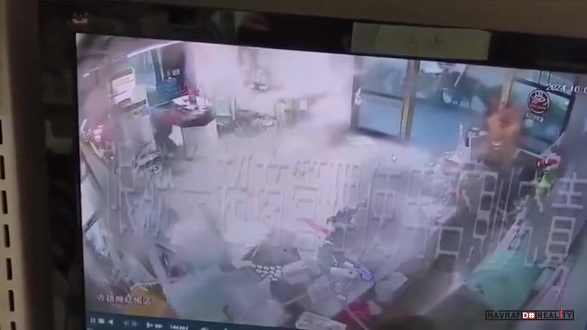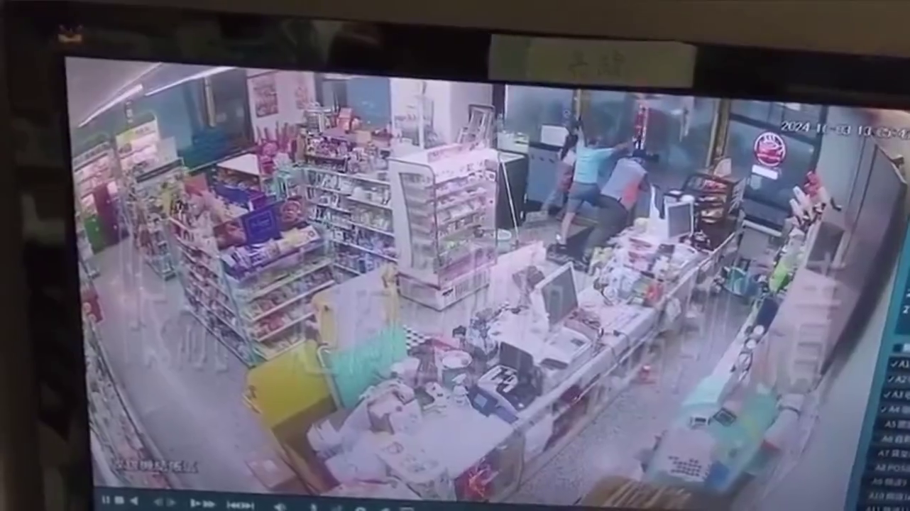 Pracovníci prodejny 7-Eleven drží dveře, načež je následně odfoukl tajfun Krathon