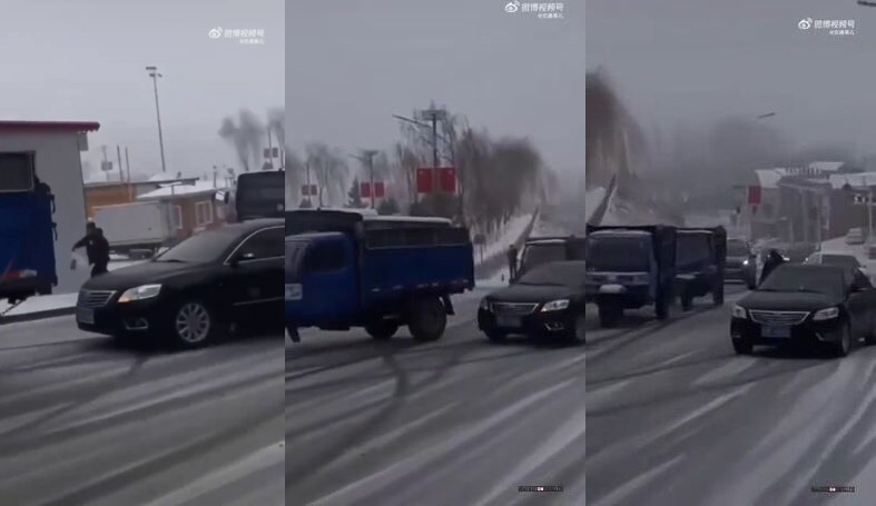 Všimněte si, že Toyotě to neklouzalo, ta zabrzdila. Protože ti kreténi v těch tříkolových sračkách na nic mají jen klasické letňáky. Stačí si vzpomenout u nás za bolševika na Avie a ty jejich hladké užší gumy jen se čtyřmi klikatými drážkami, které klouzaly jak prase už na mokru, natož na sněhu či námraze, to Avie nevyjela ani krtinu.