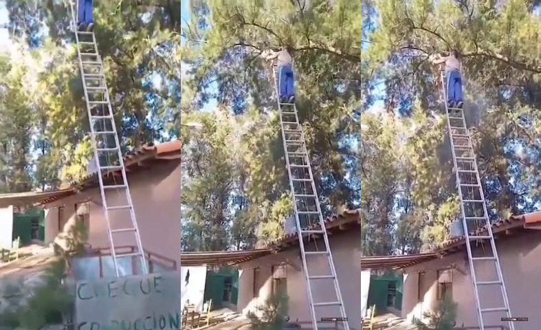 Další lekce fyziky. Příště si ten žebřík k tý větvi přiváže. A pak zjistí, že se mu tím trhem v polovině rozpojí a ta spodní půlka upadne. A ten pomocník pak zjistí, že si tu dolní půlku o tu visící neopře. Nakonec se ukáže, že lepší by bylo tu devítiletku dokončit.