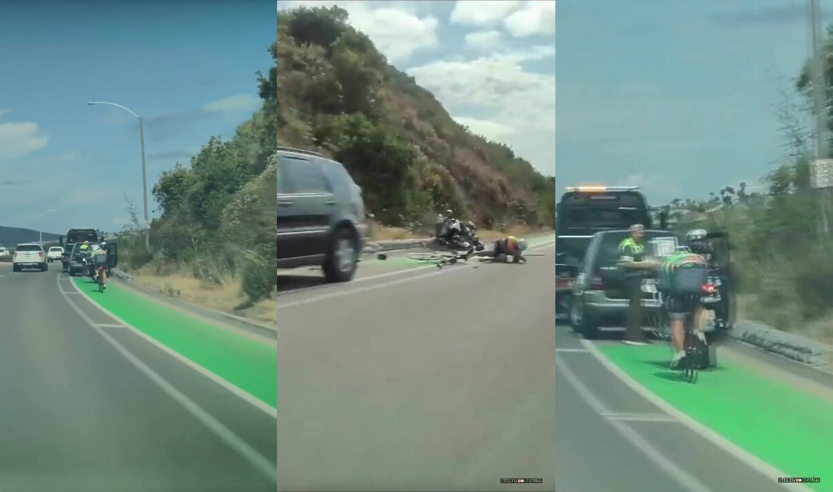 Ve čtvrtek odpoledne došlo v kalifornském Carlsbadu k neobvyklé nehodě, když cyklista narazil do zaparkované policejní motorky stojící v cyklopruhu na La Costa Avenue, zatímco za asistence policie probíhalo odtahování jiného vozidla. Celý incident byl zaznamenán dramatickým záznamem z palubní kamery. Podle vyjádření cyklisty, který utrpěl středně těžká zranění, byl v okamžiku srážky nepozorný a díval se dolů. Policie uvedla, že motocykl byl umístěn za odtahovaným autem a došlo na něm k mírnému poškození.