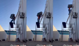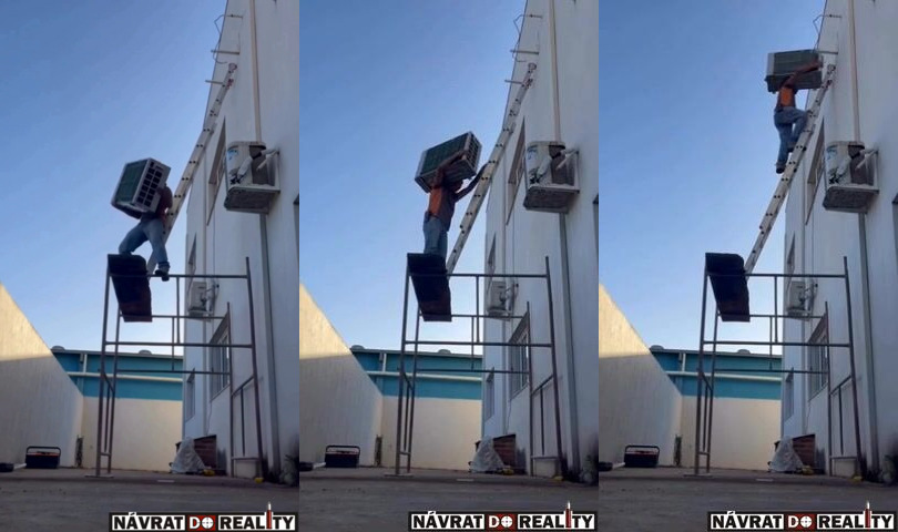 vyzerá to tak, že tým, ako chcel položiť klímu na konzoly posunul ťažisko celej sústavy lešenie/rebrík/Neger/klíma príliš ku kraju a už to išlo :-)