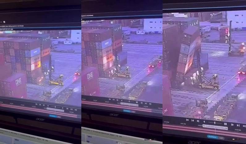 Může poděkovat tomu debilovi, pokud to tedy někdy dřív nebyl on sám, který blbě usadil kontík nejspodnější z padajícího sloupce tak, že částečně spočíval i na vedlejším kontíku, který chtěl týpek naložit.