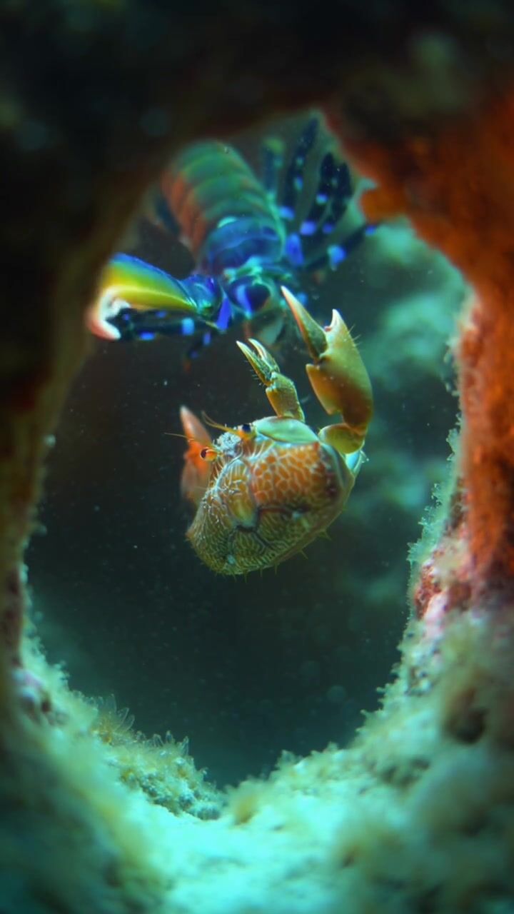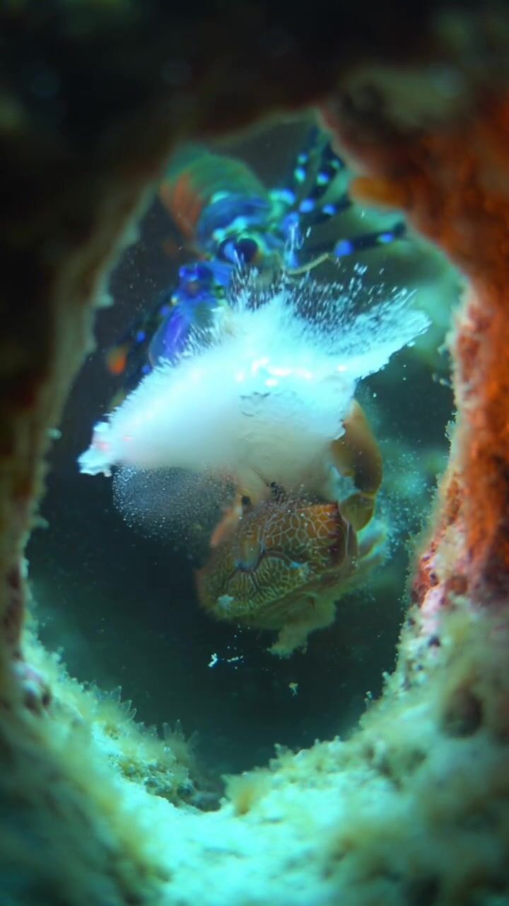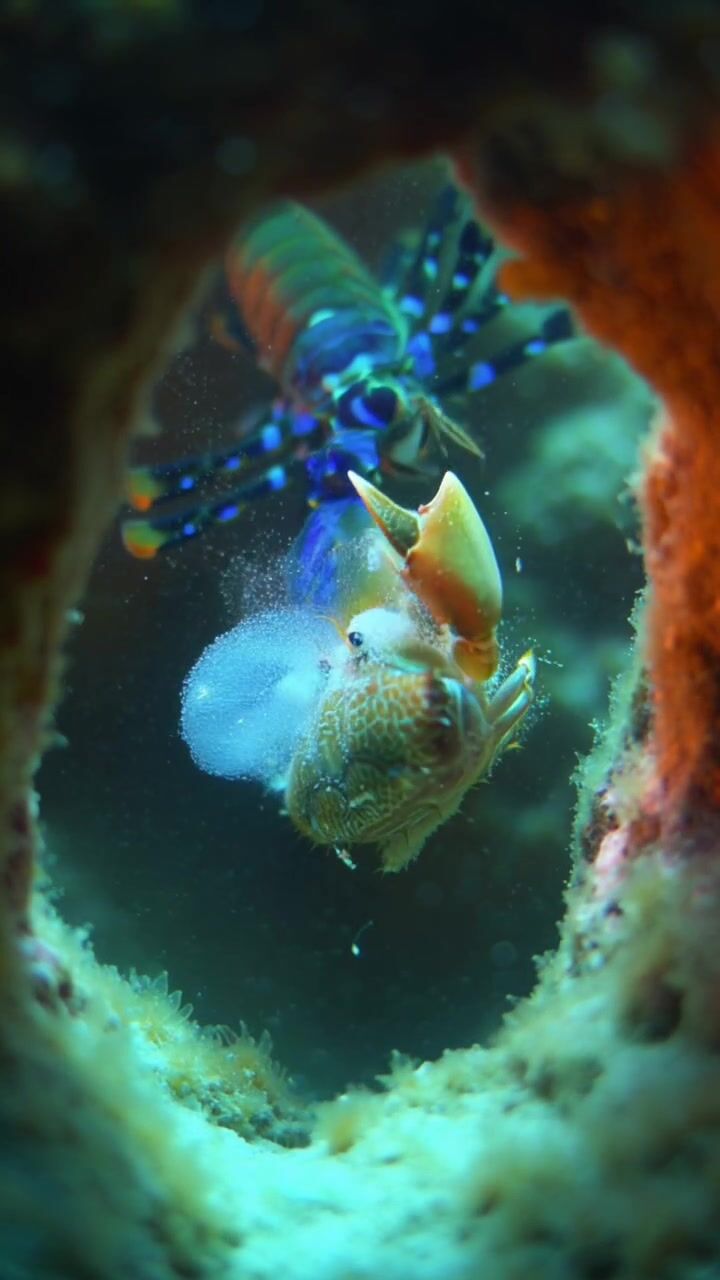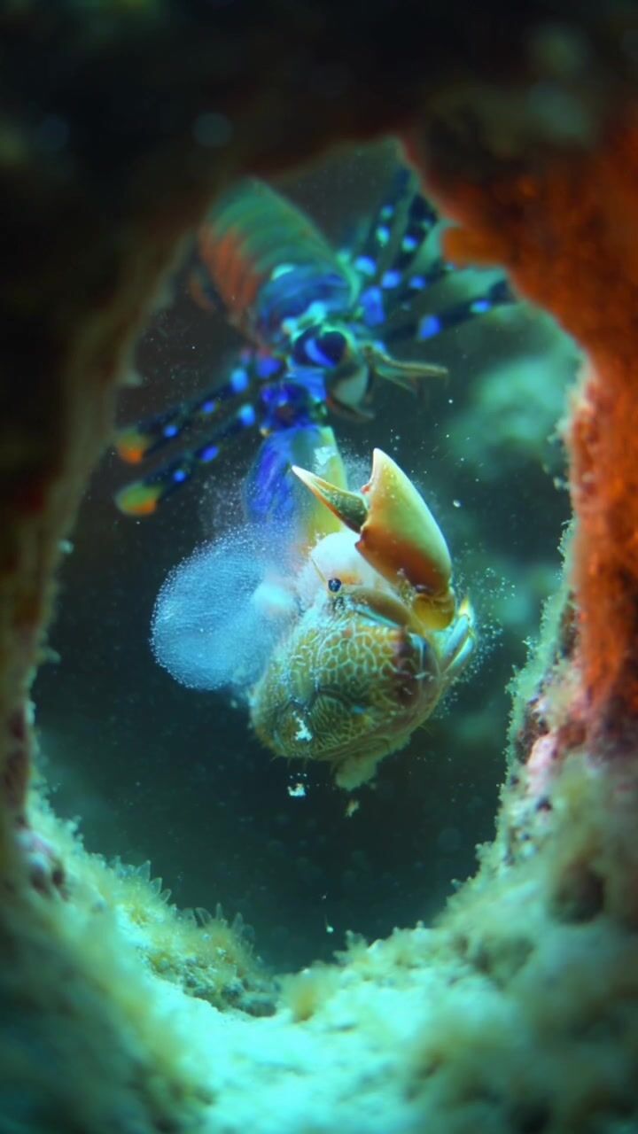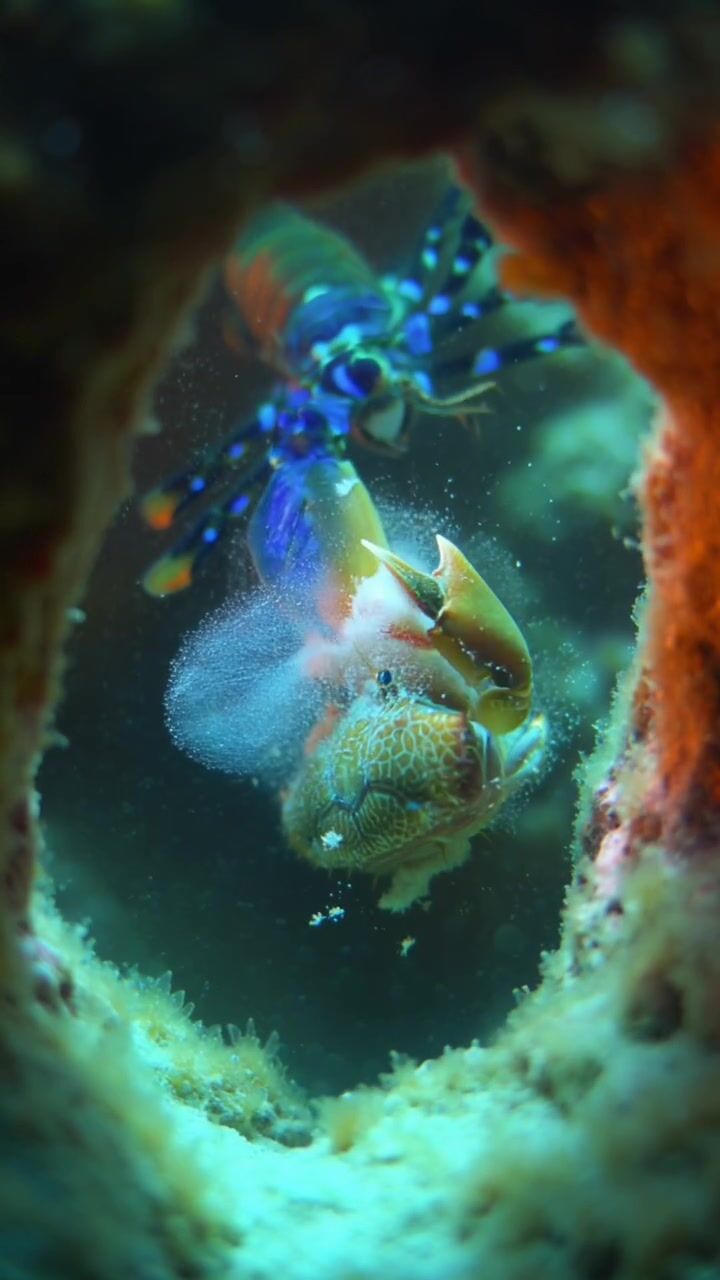 Strašek paví, známá také jako mantis shrimp, patří mezi nejpozoruhodnější predátory oceánu a její útok na kraba je považován za jeden z nejrychlejších a nejsilnějších pohybů v celé říši živočichů – její kladivovité končetiny se při úderu pohybují takovou rychlostí, že je lidské oko nedokáže zaznamenat, přičemž během zlomku milisekundy dosahují zrychlení srovnatelného s výstřelem z kulky. Při samotném nárazu vzniká pod vodou silná rázová vlna a tzv. kavitace, kdy se vytvoří drobné bubliny, které se okamžitě zhroutí a uvolní další energii, takže kořist může být zasažena nejen fyzickým úderem, ale i touto sekundární explozí. Krab nemá prakticky žádnou šanci na útěk ani varování – úder přichází bez předchozího signálu a často okamžitě rozdrtí krunýř nebo způsobí smrtelná zranění. Tento extrémně účinný mechanismus lovu řadí útok straška pavího mezi nejsilnější „mikro-útoky“ v přírodě.