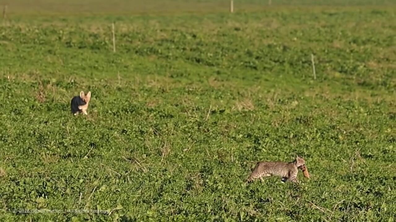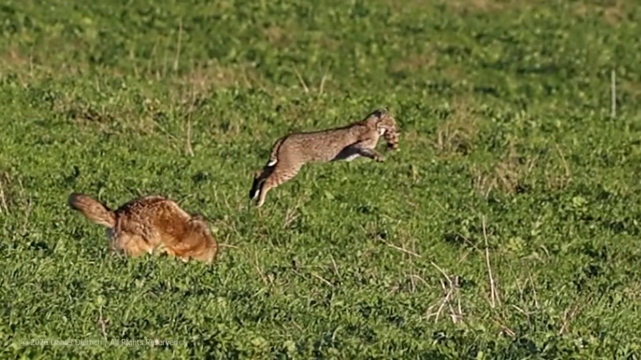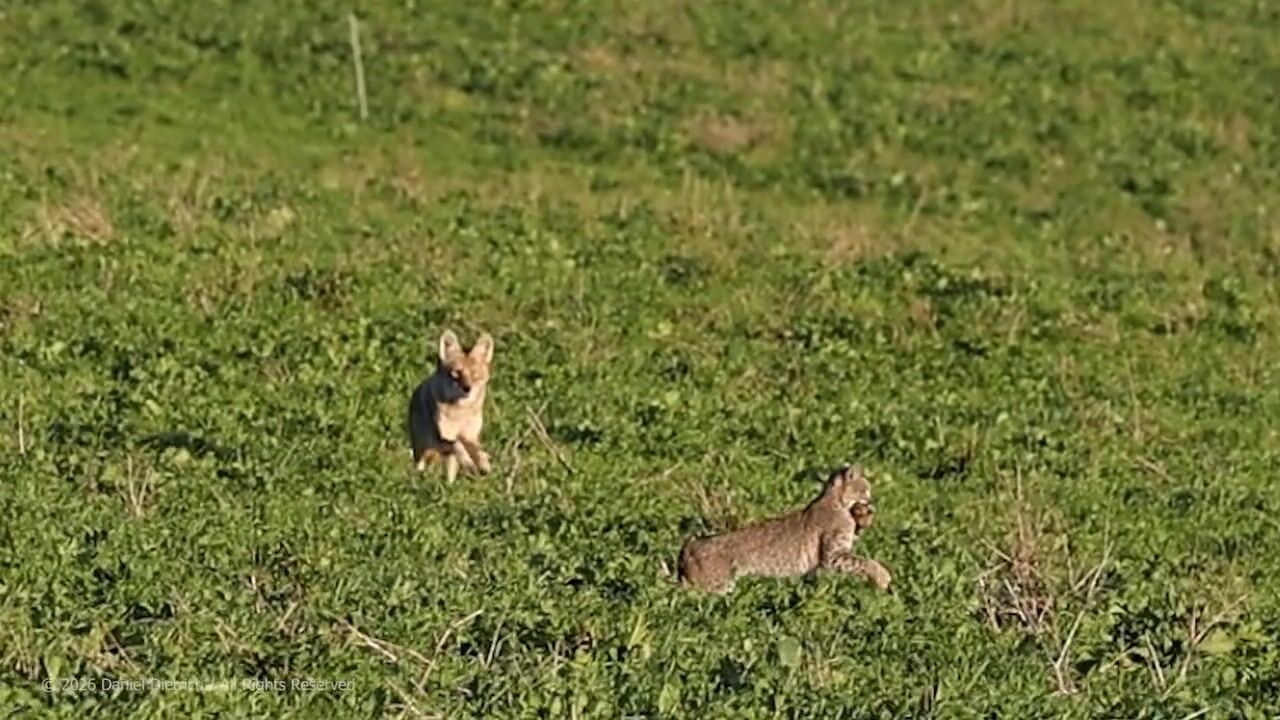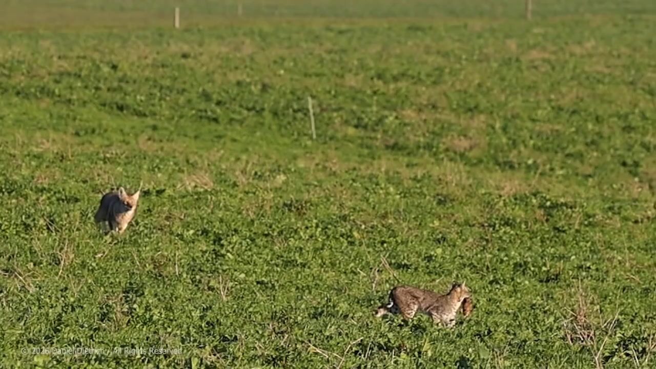 Kojotovi se ten večerníčkový manévr moc nepovedl, udělal ze sebe odrazovou plošinu pro rysa a potom už jenom blbě čuměl.