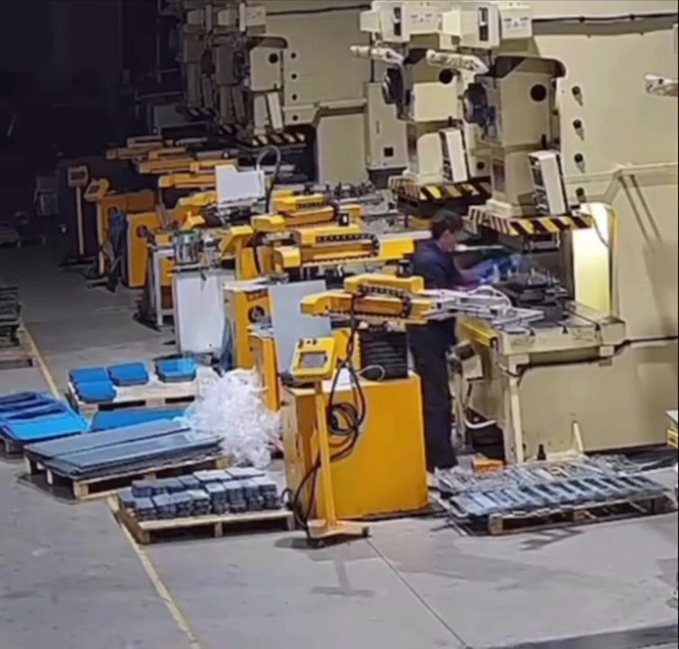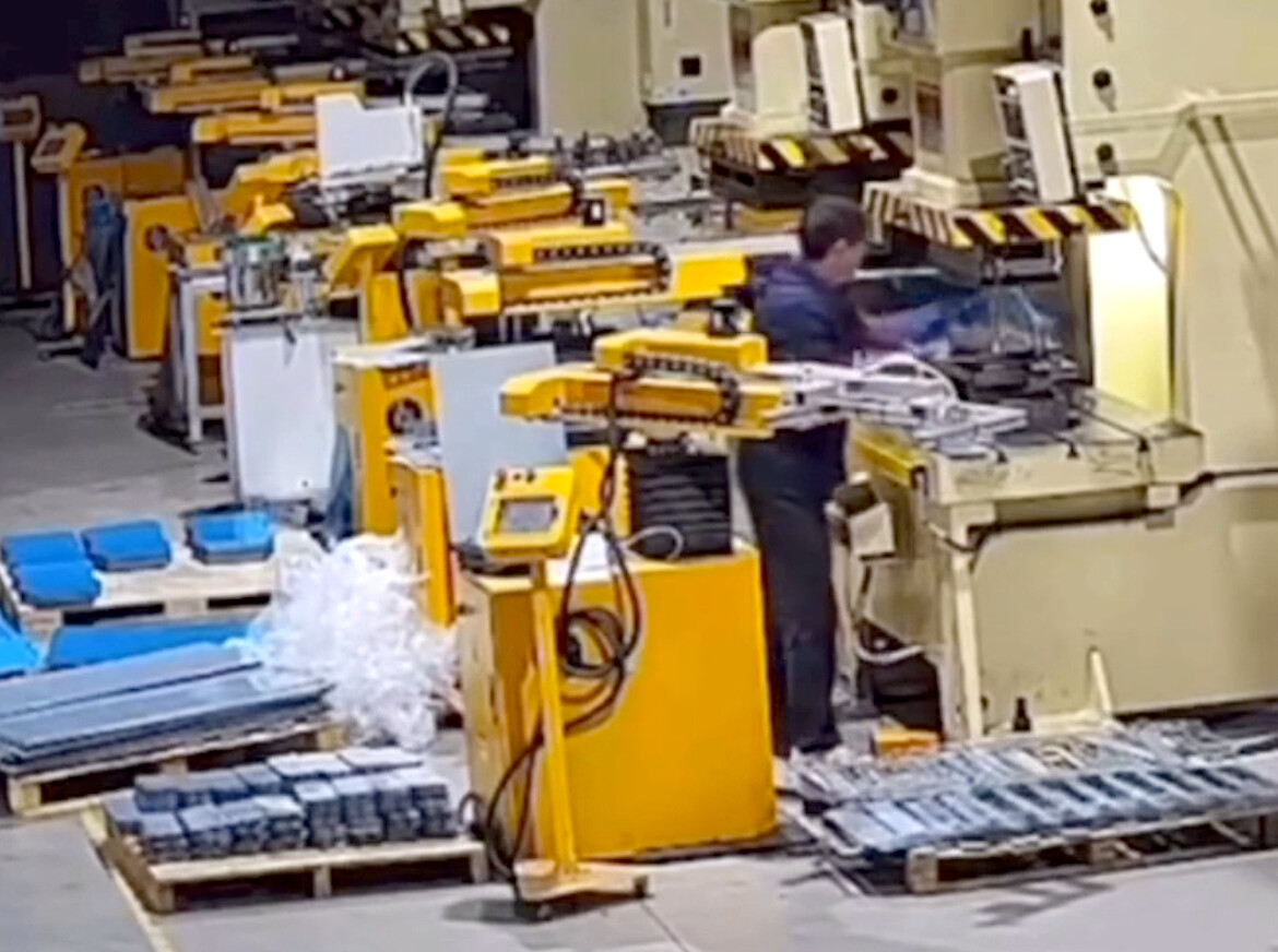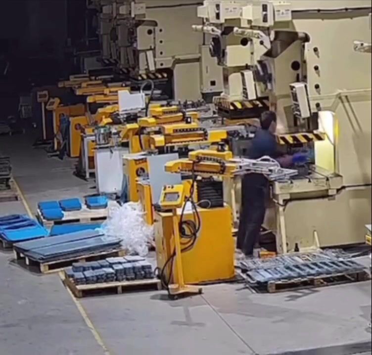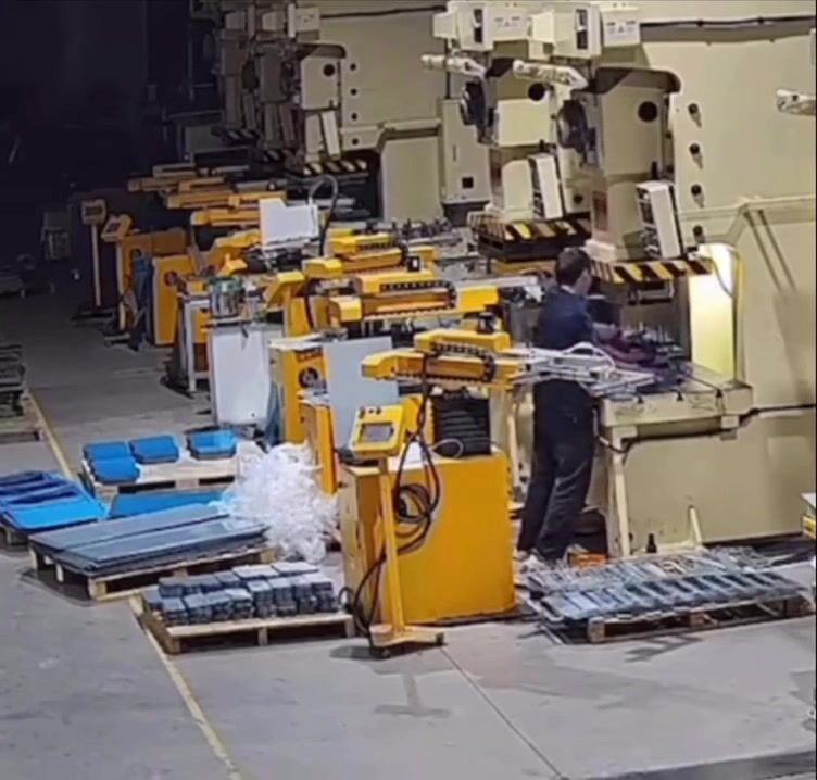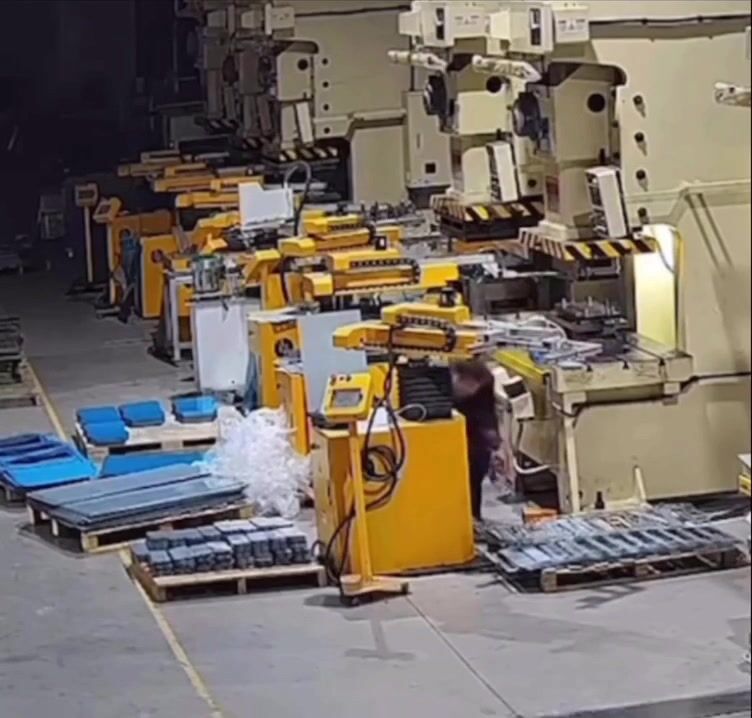 Stroj se nespustil automaticky. Na záběru je vidět, že dělník vložil špičku boty do spouštěče, zřejmě omylem, ale na to vám lis sere.