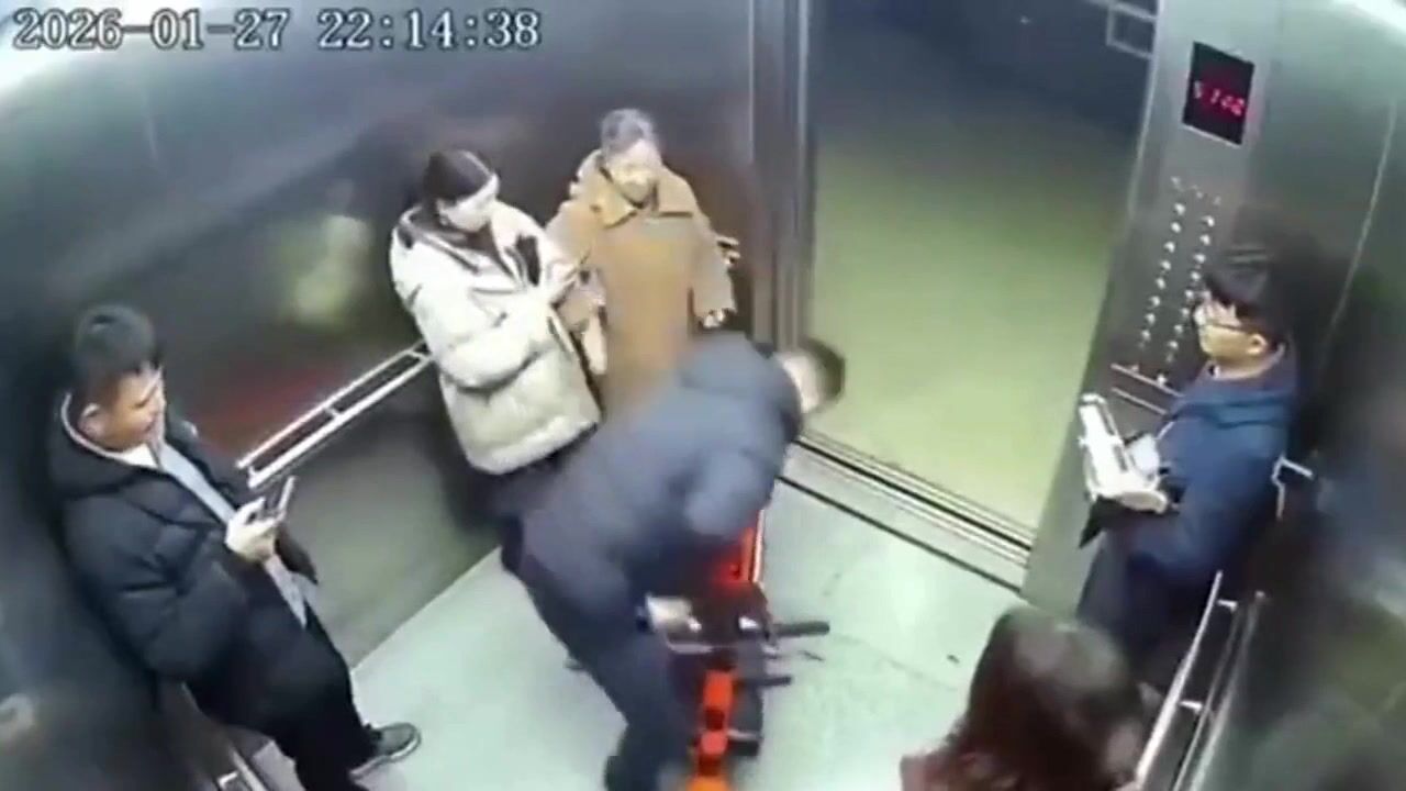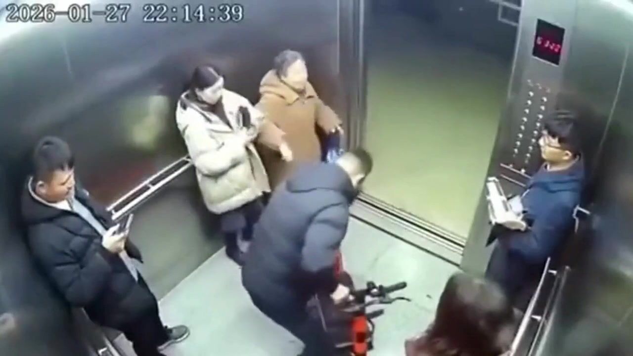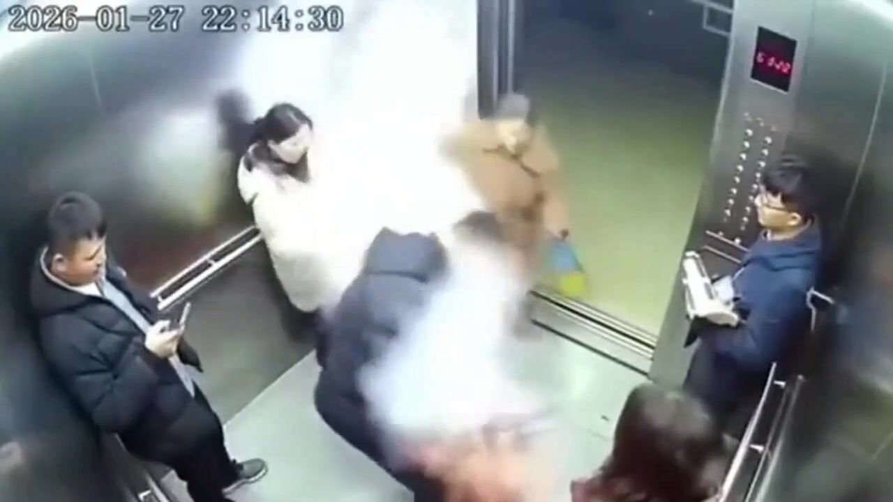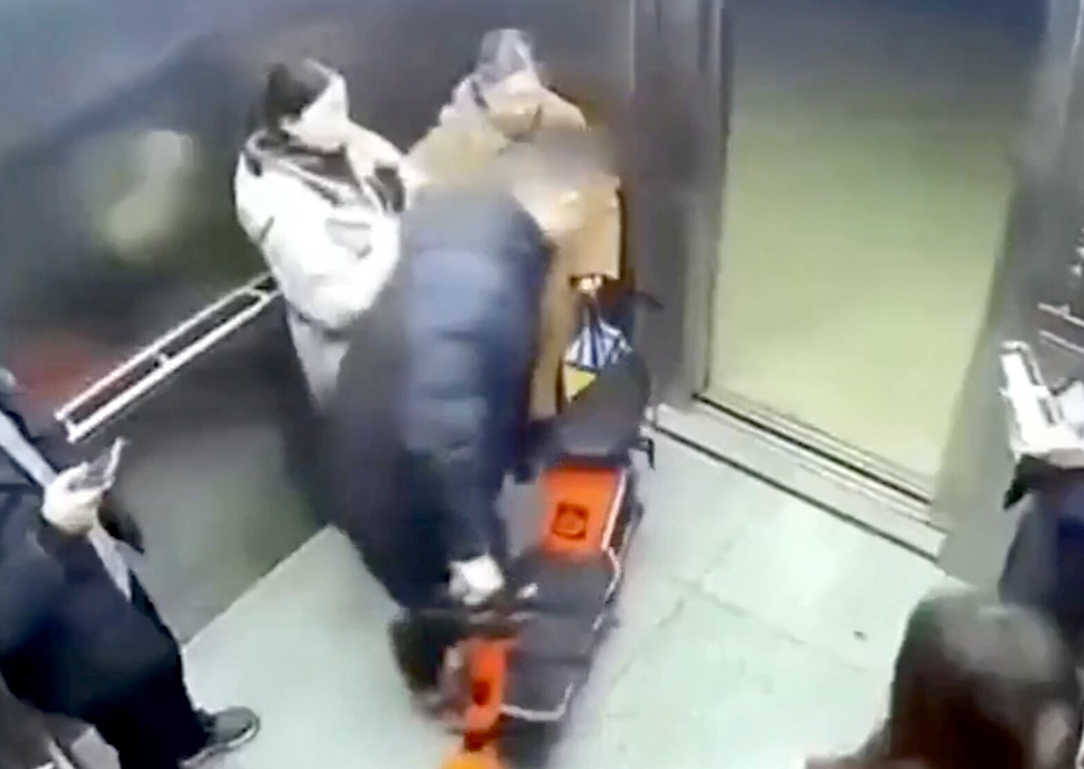 Jak se ta píča s igelitkou snaží utéct dovnitř výtahu...