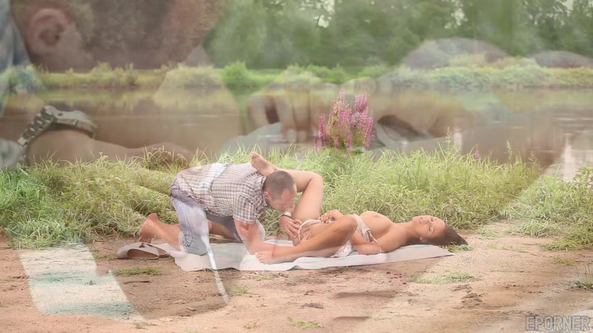 Sexy bruneta Viktoria Sweet nenasytně kouří obří péro venku v přírodě