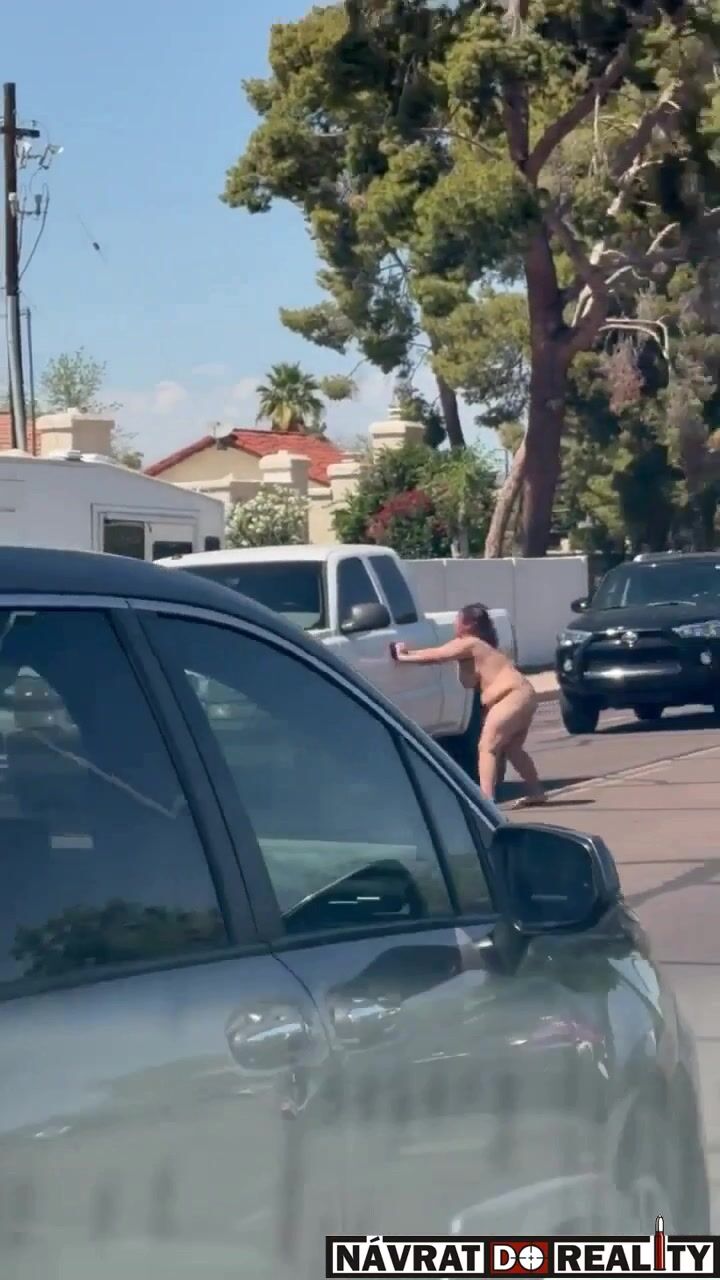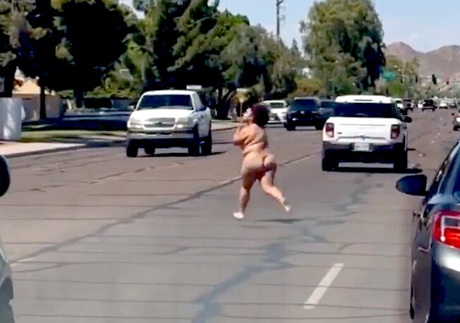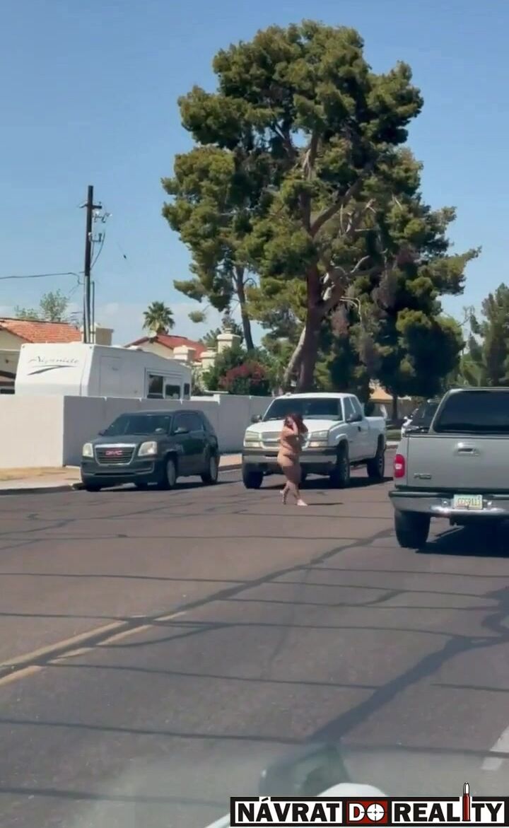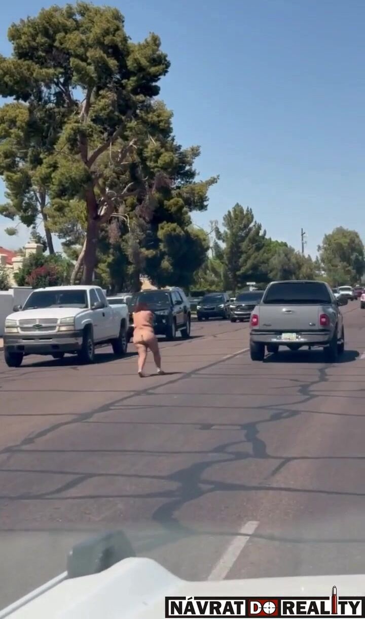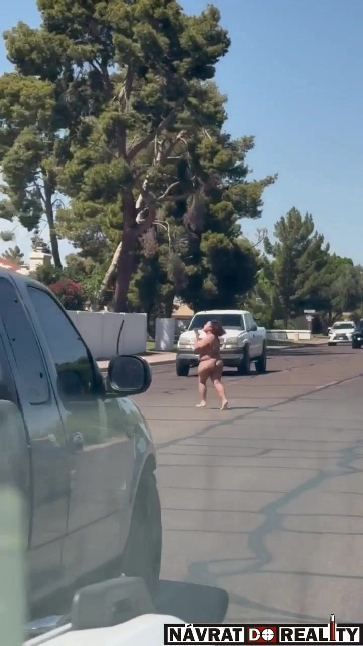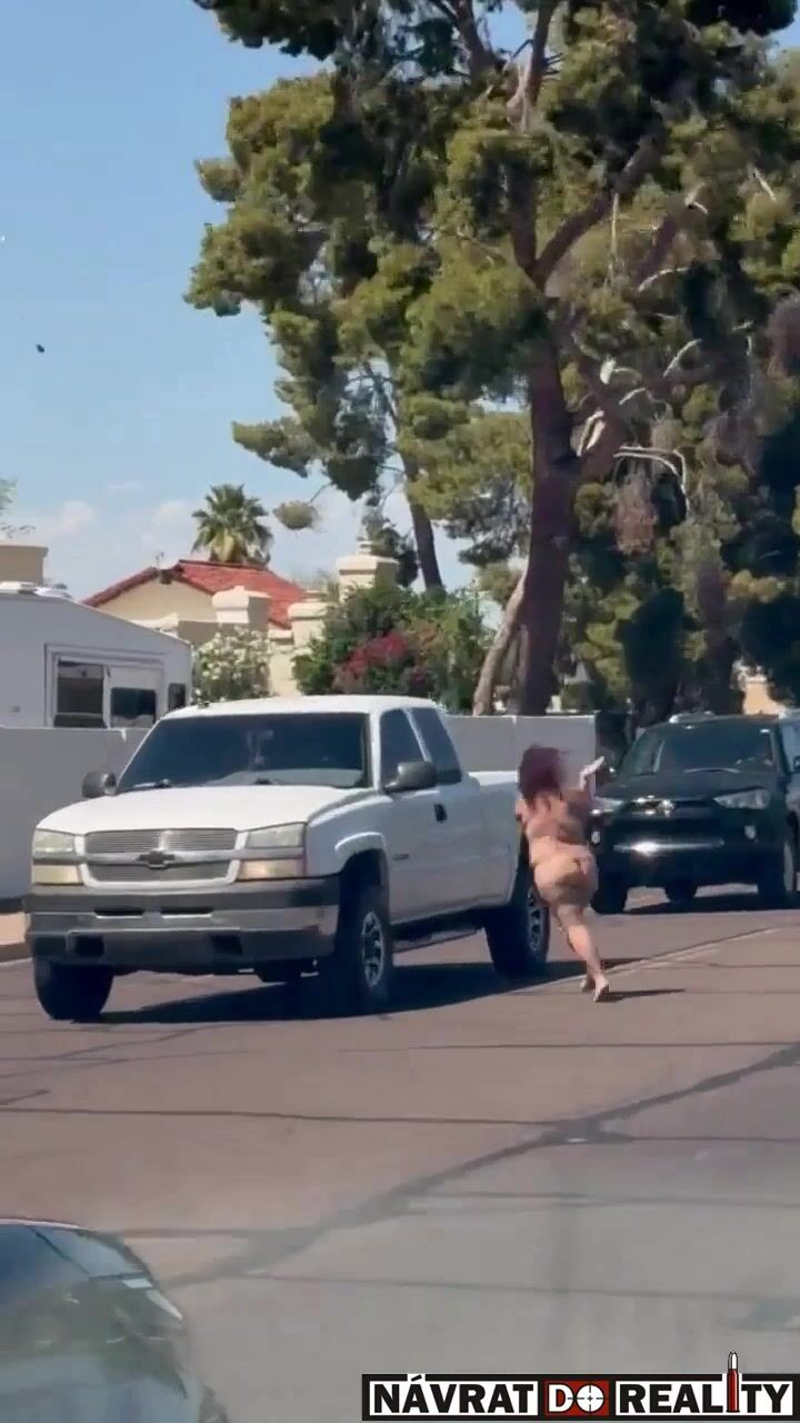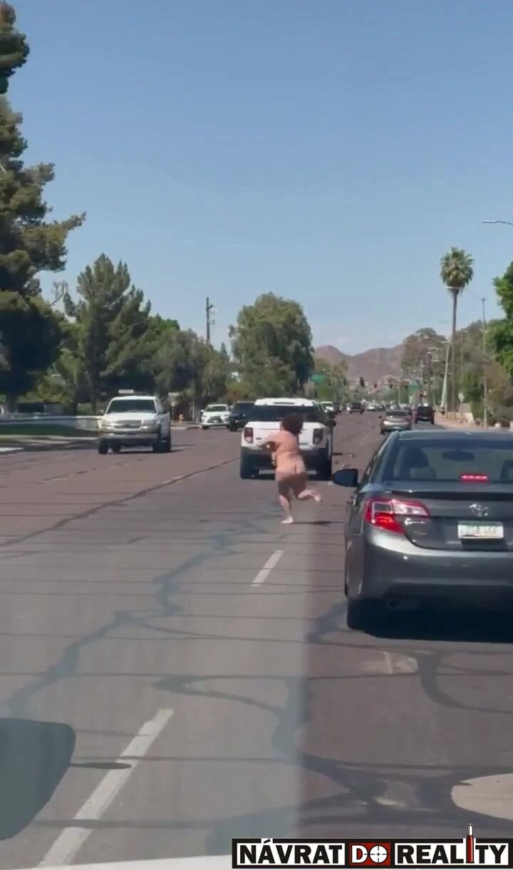 Nahá fackující se žena pobíhající po silnici