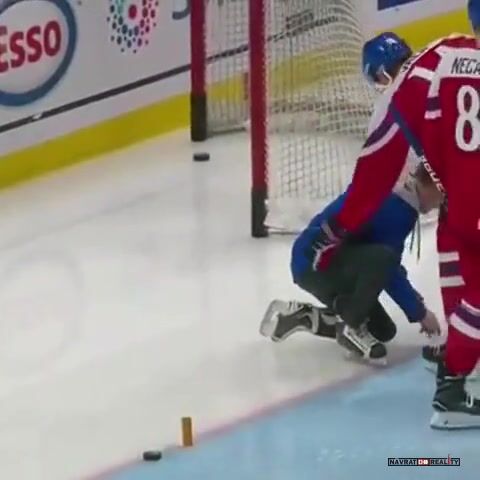 Je to chyba toho týpka co tam upevňuje branku. Hokejisti vyjednou na led, jsou nabuzený na těžkej zápas a absolutně nevnímají, jestli tam někdo je nebo ne. Kdo takovej sport dělal pochopí.