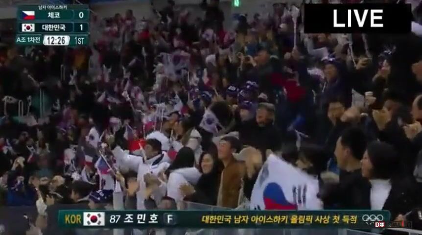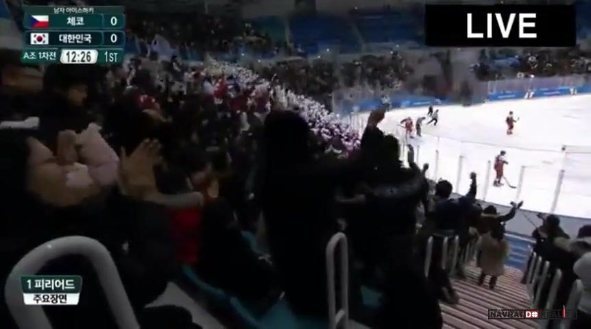 JÍŽNÍ KOREA: Radost komentátorů a fanoušků po vedoucí brance jihokorejských hokejistů nad českým výběrem. Brock Radunske od levého mantinelu přistrčil kotouč na volného Min-ho Choa, který si ve vysoké rychlosti najel do mezikruží a poté přesnou střelou nad vyrážečku překonal Francouze. Naší díky brankám Kováře a Řepíka zápas otočili a překvapivě vyhráli pouze 2:1 (40:18 na střely).