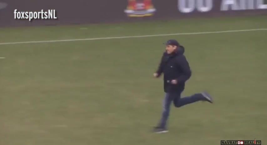 Na tribuně:" Hele, o co, že nedobehnes do té hromady a neplacnes pořadatelé po zadku!"