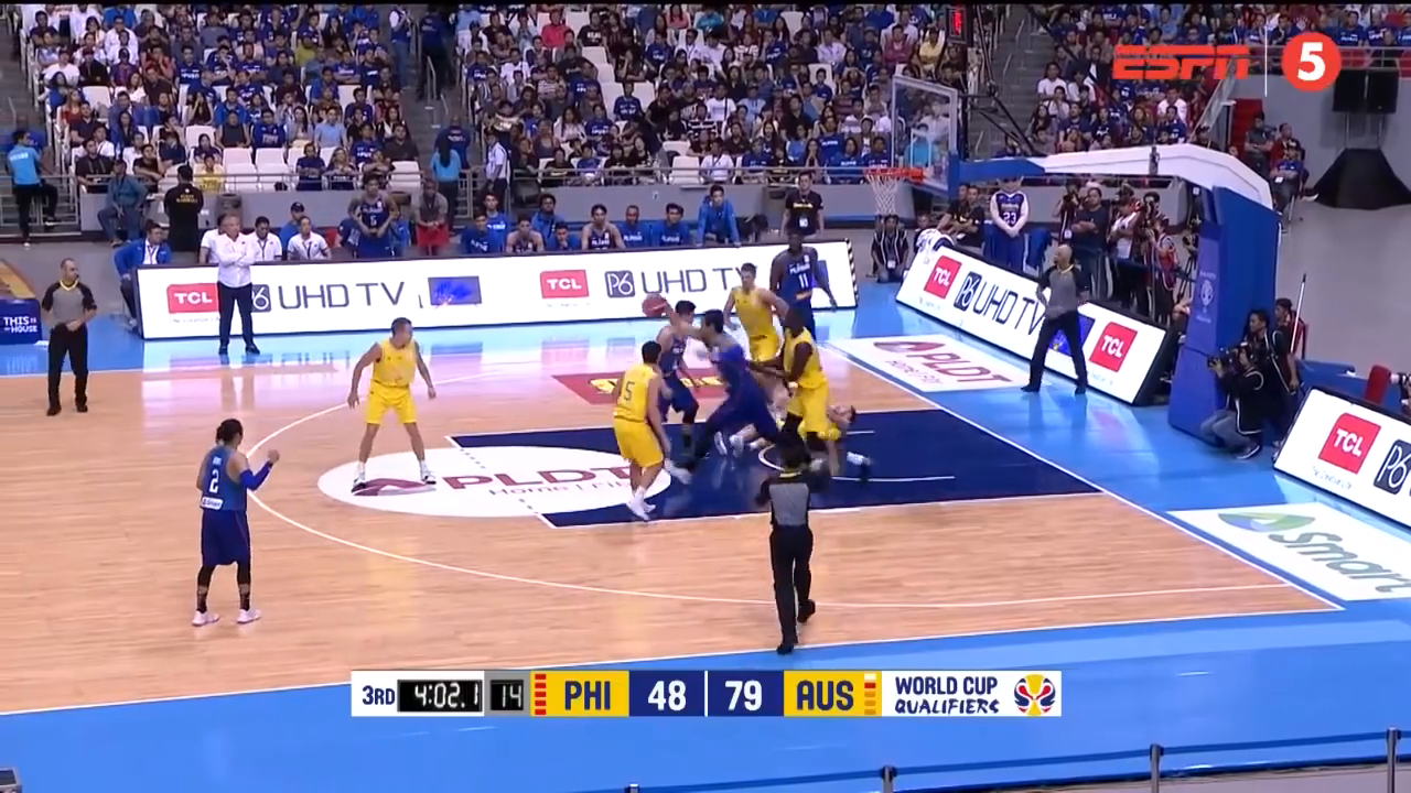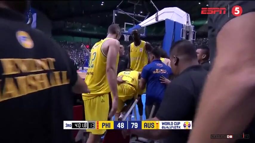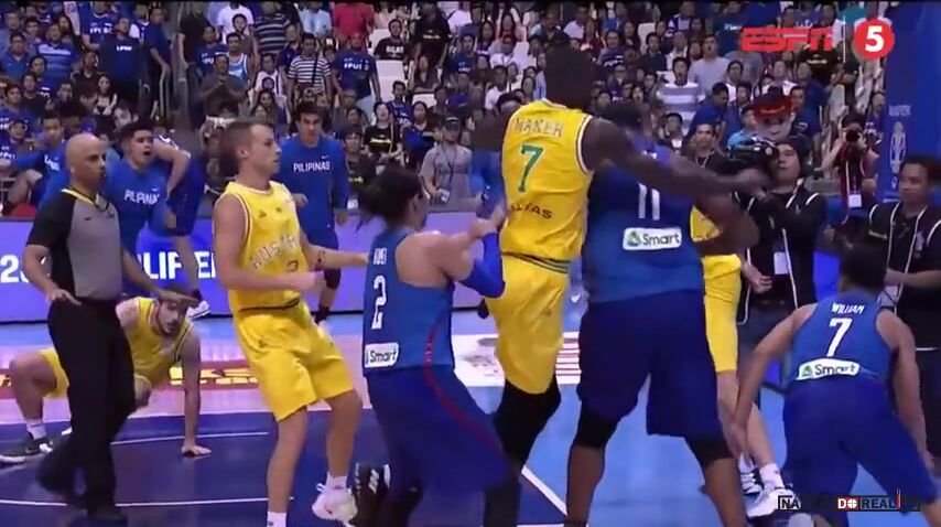 Zápas asijské části kvalifikace byl ve třetí čtvrtině prakticky rozhodnutý, když hostující Australané vedli 79:48. Pak se ale australskému pivotovi Danielu Kickertovi znelíbil ostrý zákrok domácího křídelníka Rogera Pogoye na spoluhráče ve žlutém dresu Anthonyho Carla Drmice. Loktem Pogoye sestřelil k zemi a tím rozpoutal hromadnou bitku, do které se zapojili i hráči z lavičky a několik trenérů.