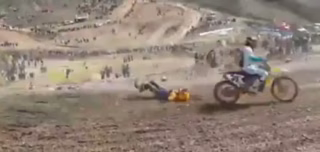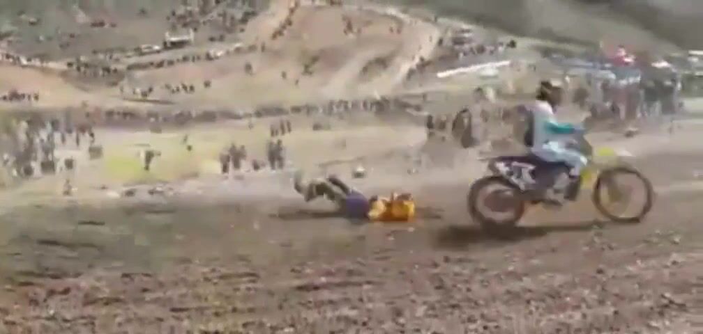 Závodník, který je po ošklivém pádu několikrát nechtěně přejetý soupeři.. po chvíli vstane a pokračuje v závodě ???