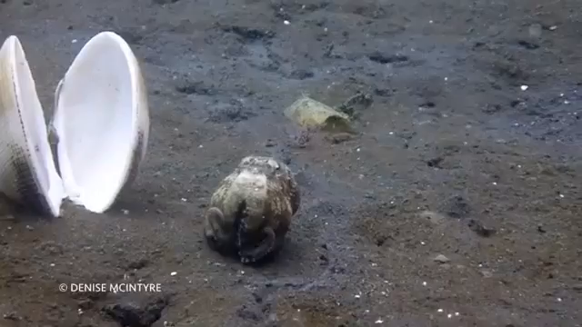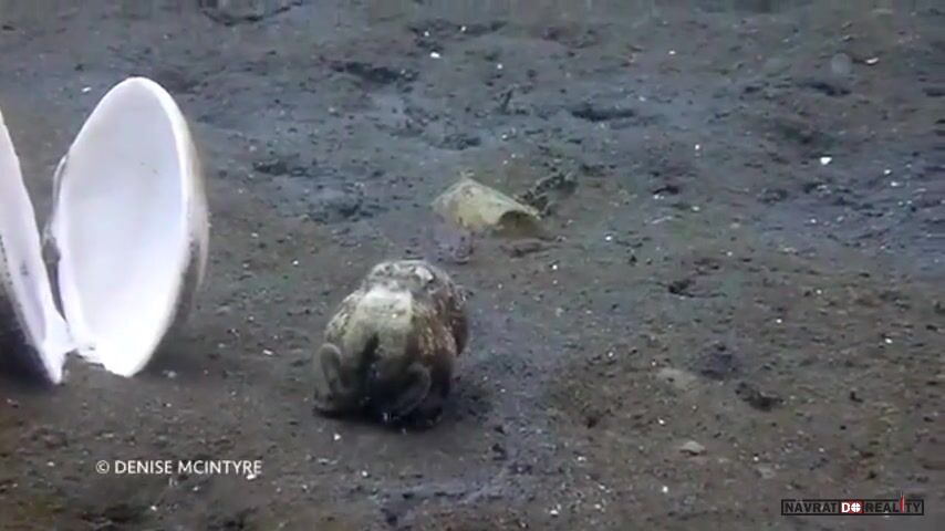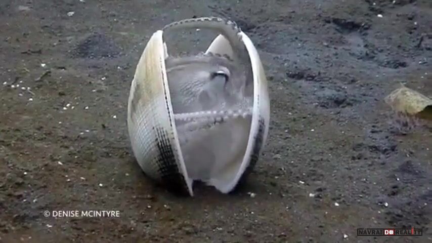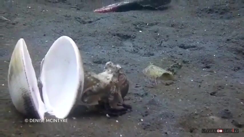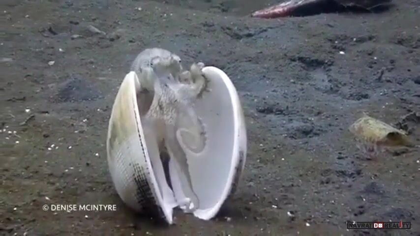 INDONÉSIE: Potápěčka natočil u ostrova Lembeh chobotnici žilkovanou (amphioctopus marginatus), které se také říká "kokosová" (ze skořápek kokosů si totiž dělají domovy). Do skrýše se schovávají hlavně před predátory - v tomto případě k tomu posloužila mušle.