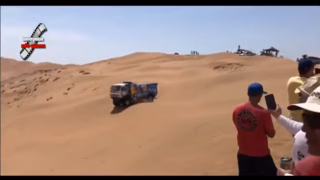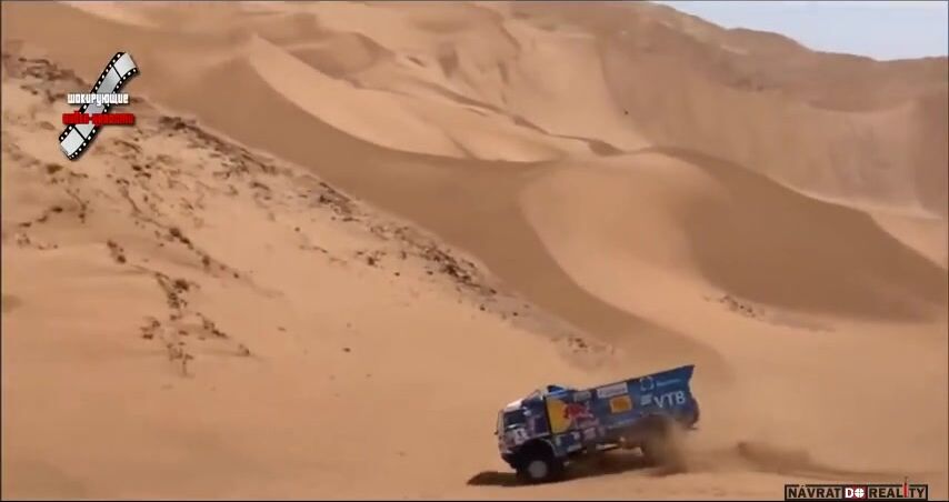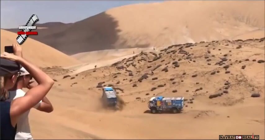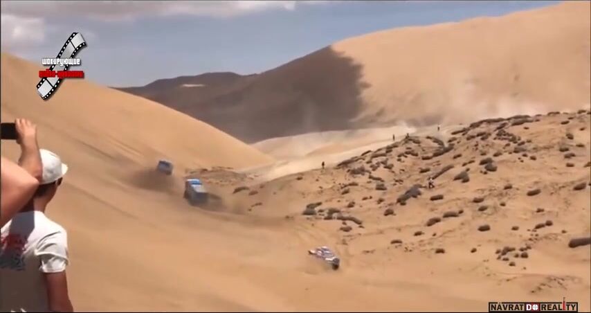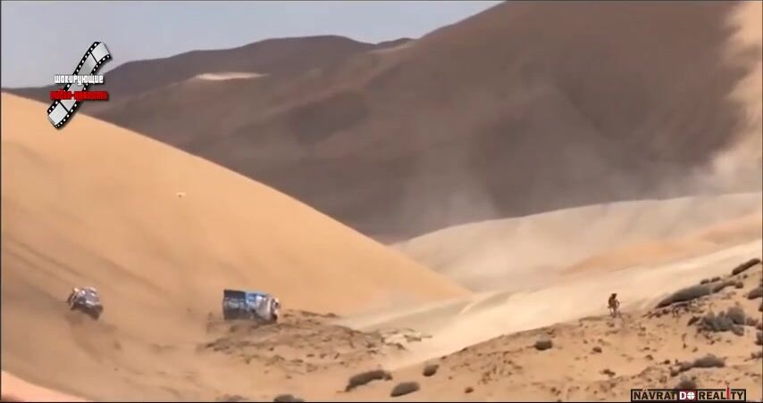 Tihle borci mají plné ruce práce udržet ten kamion v dunách a ještě se má starat o nějakého blbečka? Stačí se podívat v čase 0:31 jak to auto co jede za nimi vyjede trochu víc na dunu a hned ho to stáhne dolů a je to prakticky neovladatelné. Stejně jel Karginov na ty osly. Ale protože je to Rus tak dostane okamžitě diskvalifikuje. Navíc to bylo těsně za checkpointem jak jde vidět na začátku videa.