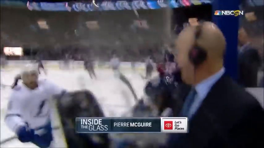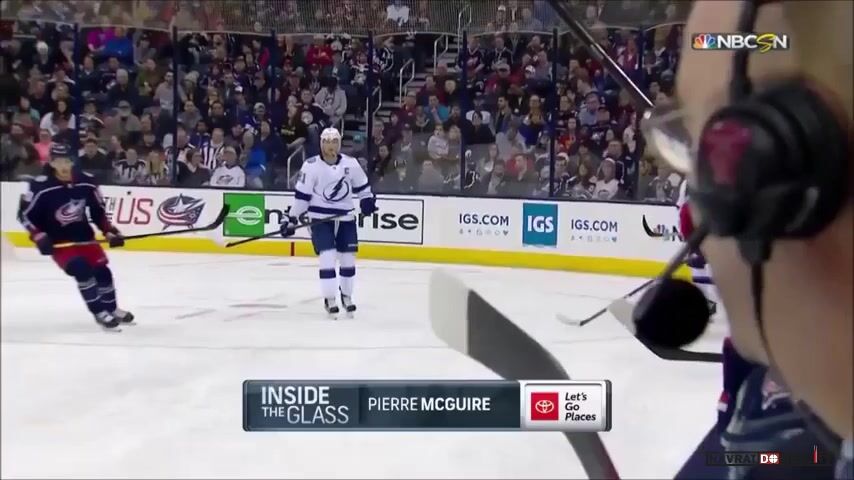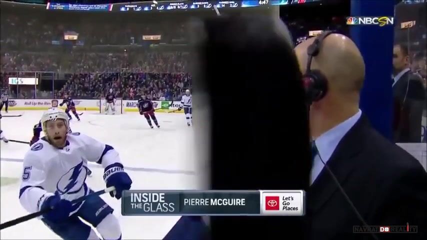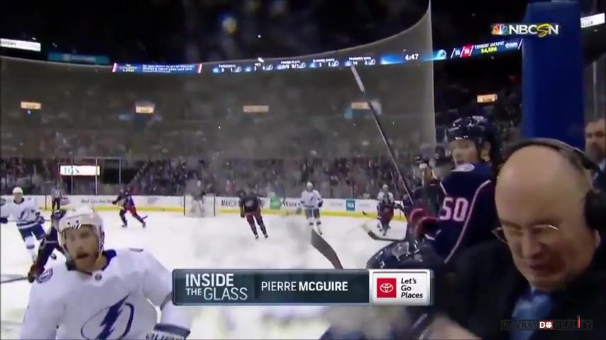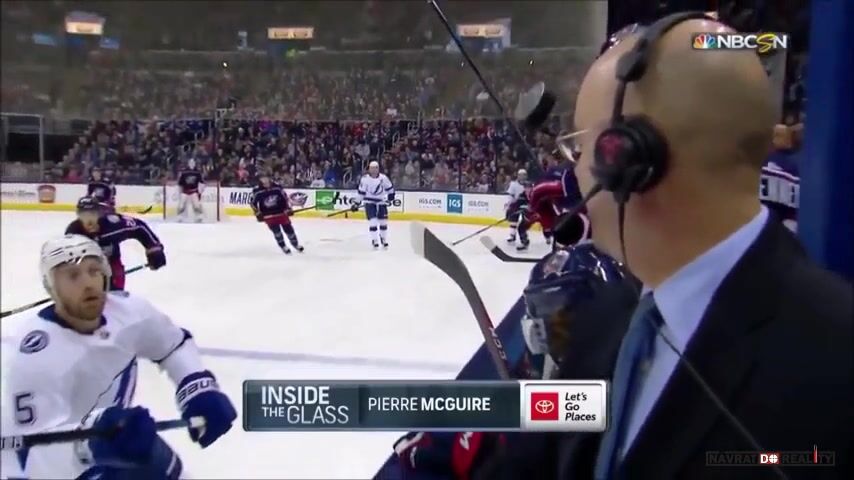 Ten puk se nedostal za ochranné sklo. Ti komentátoři stojí mezi střídačkami, kde ochranné sklo není. Jen kousek z boku od střídačky a ne všude. Puky k nim lítají celkem často, až se divím, že zatím to nikomu hlavu neustřelilo.