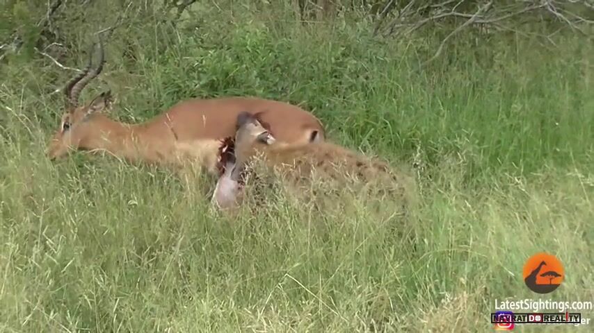 "hladová hyena požírá za živa samce impaly". To má logiku, kdyby zdechla, tak by samce impaly nepožírala.