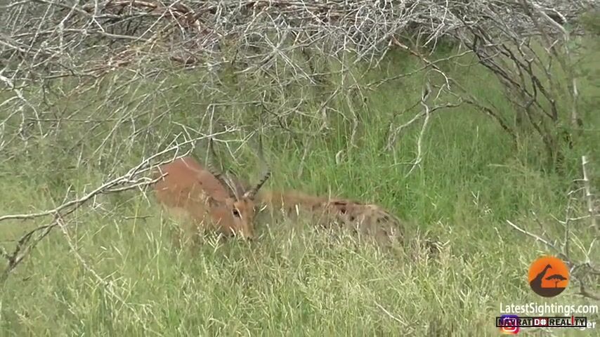 Prave leopard tu impalu ulovil a hyena si ju ukradla. Leo caka co mu po hyene ostane.