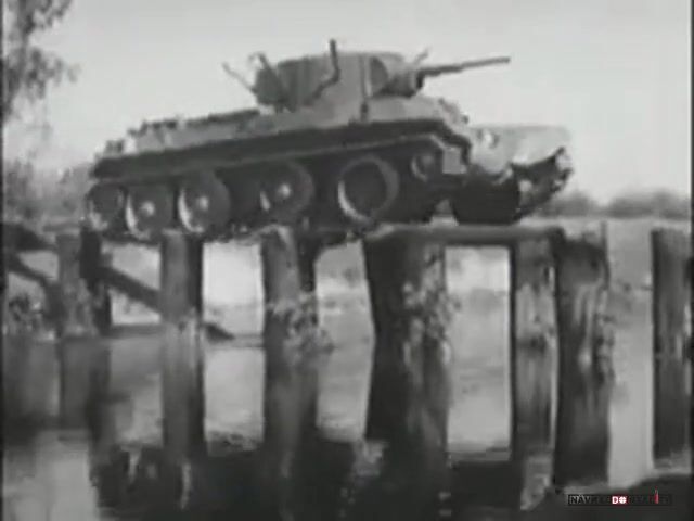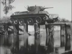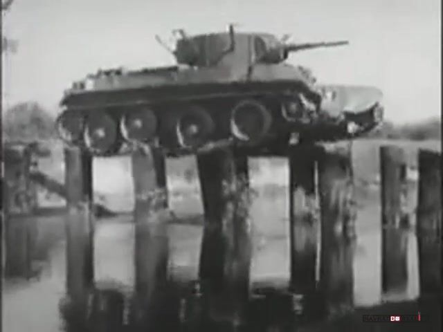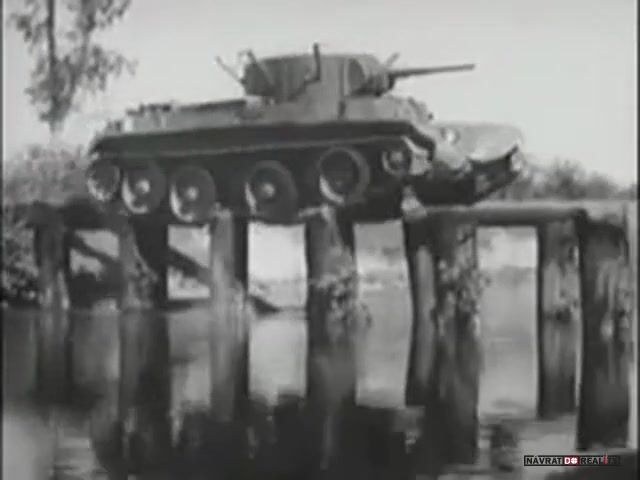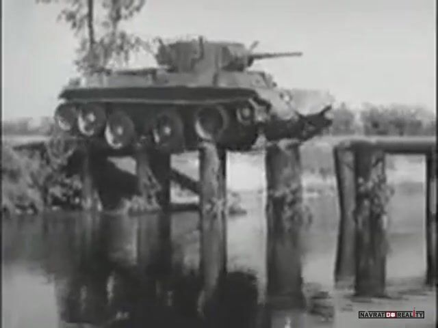 Staré záběry, na kterých tank T-34 jede po speciálně vytvořeném mostě z dřevěných kulatin.