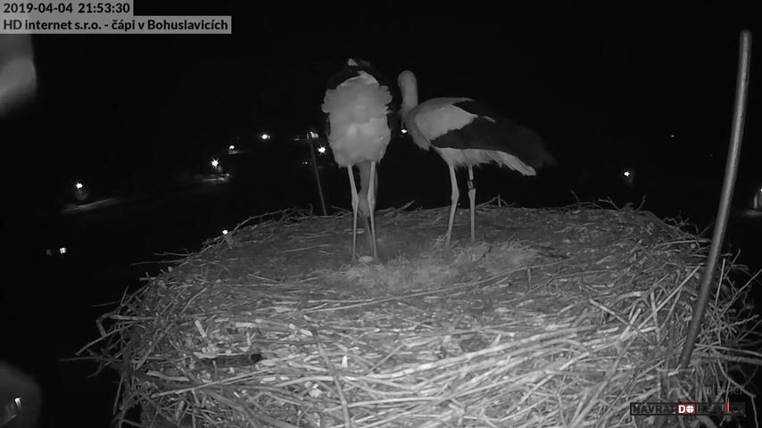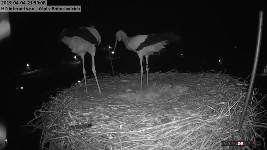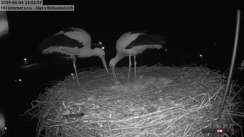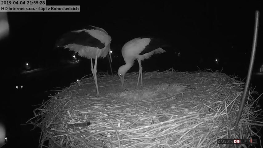 4.dubna 2019, Bohuslavice, ČR: Kamera u hnízda v Bohuslavicích u Trutnova zachytila radost čapího páru po snesení prvního vejce.