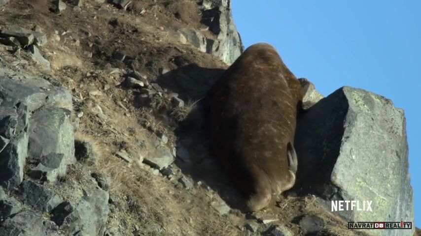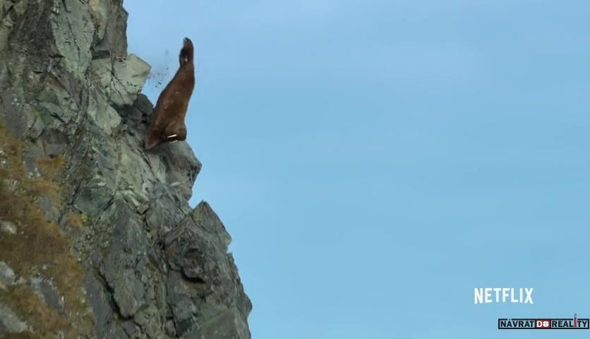 RUSKO: Úryvek z dokumentu "Our Planet" od britského režiséra a přírodovědce Davida AttenboroughaN a Netflixu, ve kterém jsou zaznamenány pády mrožů ledních z útesů u Beringova průlivu. Filmaři tvrdí, že na pevninu mrože vyhání globální oteplování a nedostatek ledovců. Jiní zoologové to označují za blbost, a ploutvonožci lezou nahoru se ukrýt před lednimi.medvědy.