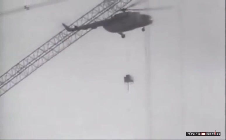2.října 1986, Černobyl, UKRAJINA: Autentické záběry pádu víceúčelové helikoptéry Mil Mi-8, která zavadila vrtulí o lana jeřábu, jenž stál poblíž zničeného reaktoru. Pilot byl údajně oslněn sluncem a jeřáb neviděl. Zahynula celá 4členná posádka. Po této havárii byly dočasně, z bezpečnostních důvodů, zrušeny veškeré lety.