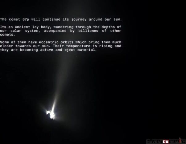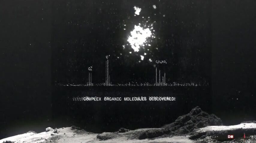 Snímky komety 67P/Čurjumov-Gerasimenko, které v letech 2014-2016 pořídila sonda Rosetta. Ta odstartovala dne 2. března 2004 po více než 10 letech (6.srpna 2014) dorazila ke kometě a 10.září 2014 vstoupila na její oběžnou dráhu. 12.listopadu 2014 přistávací modul sondy Rosetta, Philae, přistál jako první vesmírné plavidlo v historii na povrchu jádra komety. Mise byla ukončena 30.září 2016 a v roce 2017 Evropská kosmická agentura ESA zveřejnila více než 400.000 pořízených snímků. Tento materiál pak zpracovali animátoři Christian Stangl a Wolfgang Stangl do krátkého filmu.