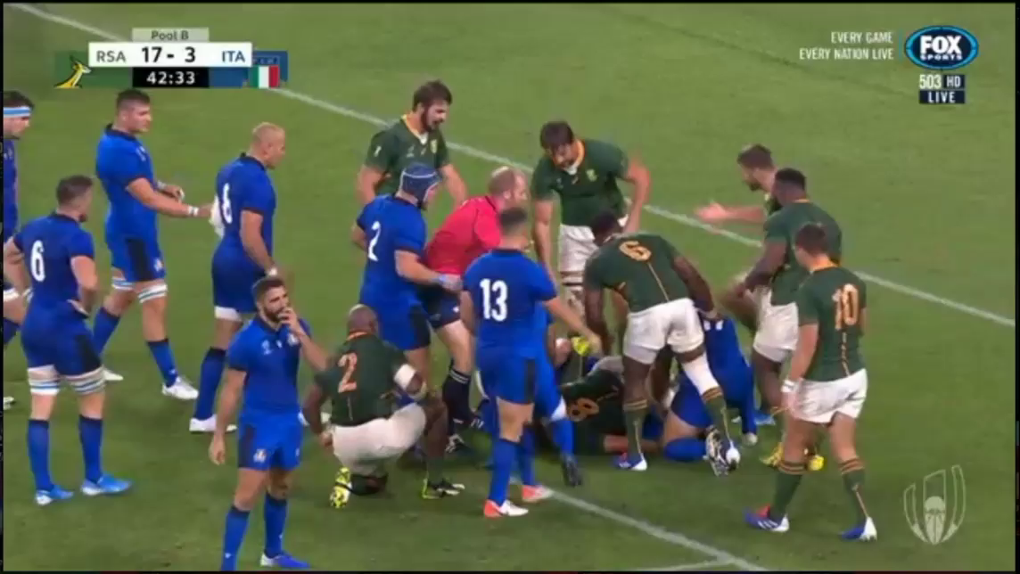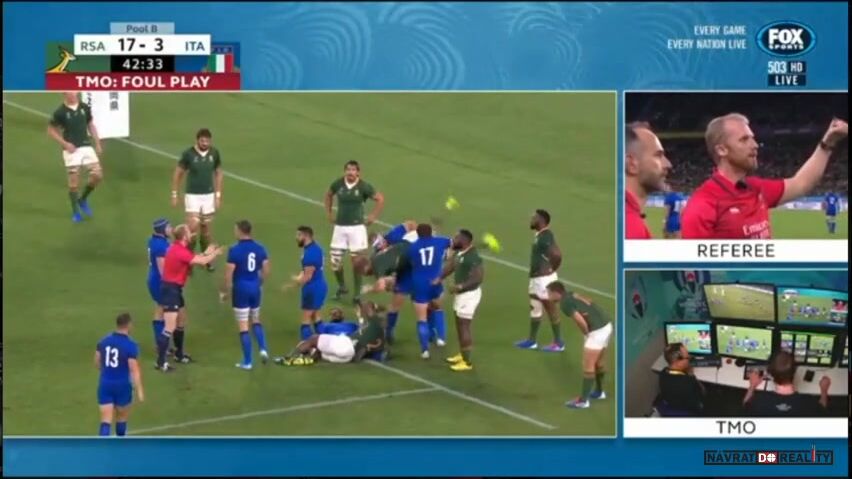 U toho prvního zase říkal hlavní rozhodčí, že viděl prvně ve vzduchu nohy a neviděl přesně, co se stalo, tak požádal o promítnutí záznamu situace. Řešil potom s ostatními kolegy, kdo začal skládku, že 17 začala skládku že ho vytáhl do vzduchu, což už se taky v rugby nesmí, zatímco 1 pokračovala a pomohla 17 a nakonec ten s 1 ho ještě schválně hodil ze vzduchu na zem, on dokončil zakázanou skládu, proto on červená