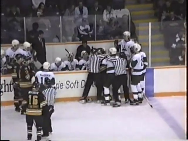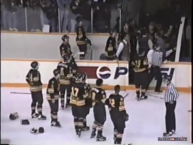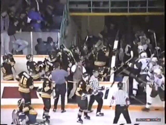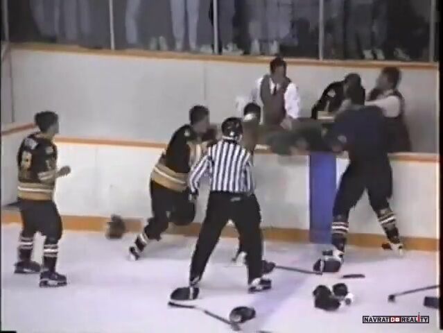 10.října 1996, Breton, KANADA: Hromadná bitka mezi týmy Cape Breton Islanders (v bílém) a Antigonish Bulldogs v juniorské lize MHL (Maritime Junior Hockey League). K urovnání sporu musela být povolána policie a například brankář hostů dostal za seknutí hokejkou doživotní zákaz hokeje. Do bitky se zapojil i jeden z domácích fanoušků.