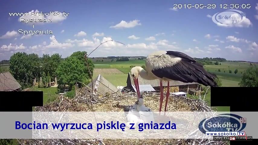 POLSKO: Samice čápa vyhodí jedno ze svých mláďat z hnízda. Toto chování je u čápů i jiných druhů ptáků zcela běžné. Čápi zabíjí nejslabšího ze svých potomků, když mu nedokáží poskytnout dostatek potravy, nebo když se mládě chová neobvykle a vykazuje známky nemoci, postižení nebo slabosti. Instinkt rodičům radí, aby se „podezřelého“ jedince zbavili a on tak nepředstavoval riziko pro ostatní zdravá mláďata.