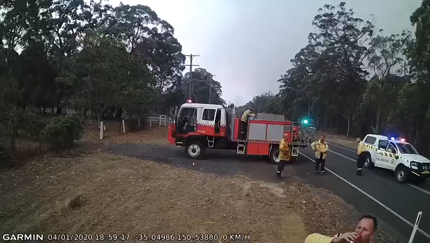 19:01.22 Crew member activates cab sprays to protect truck as fire spreads rapidly to the North.